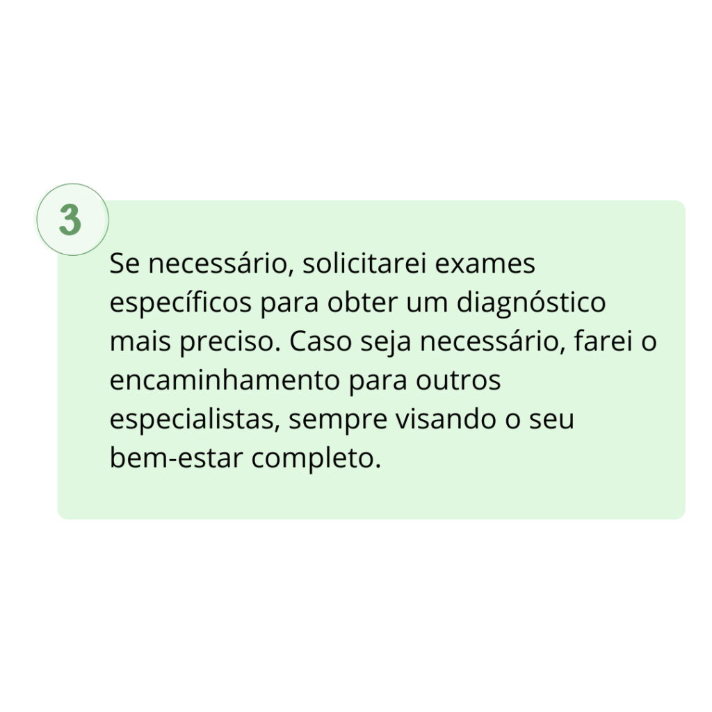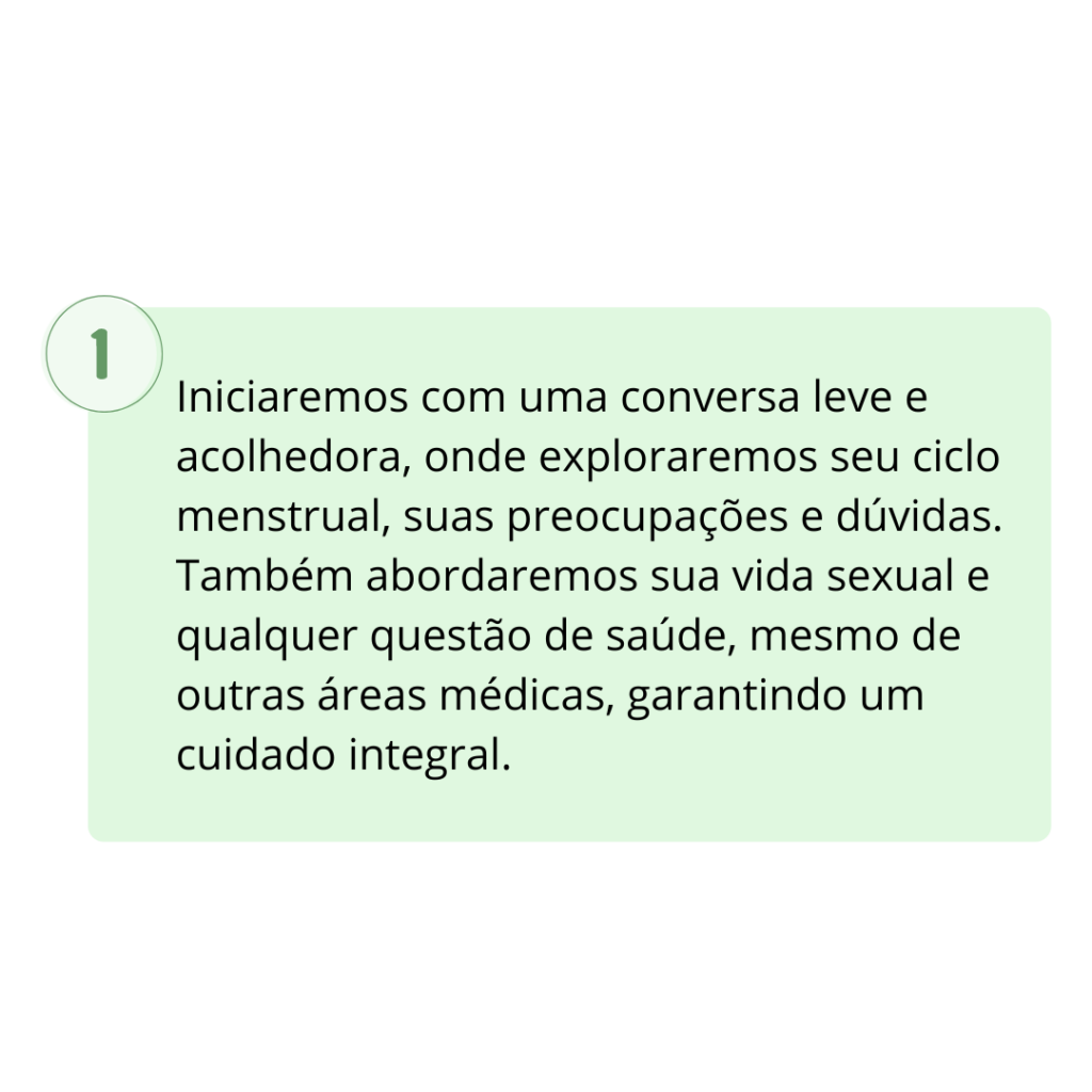 Meu compromisso com o bem-estar feminino começa aqui! Ao longo do caminho para uma saúde plena, faço questão de adotar uma abordagem humanizada, onde você será ouvida, compreendida e cuidada com empatia.